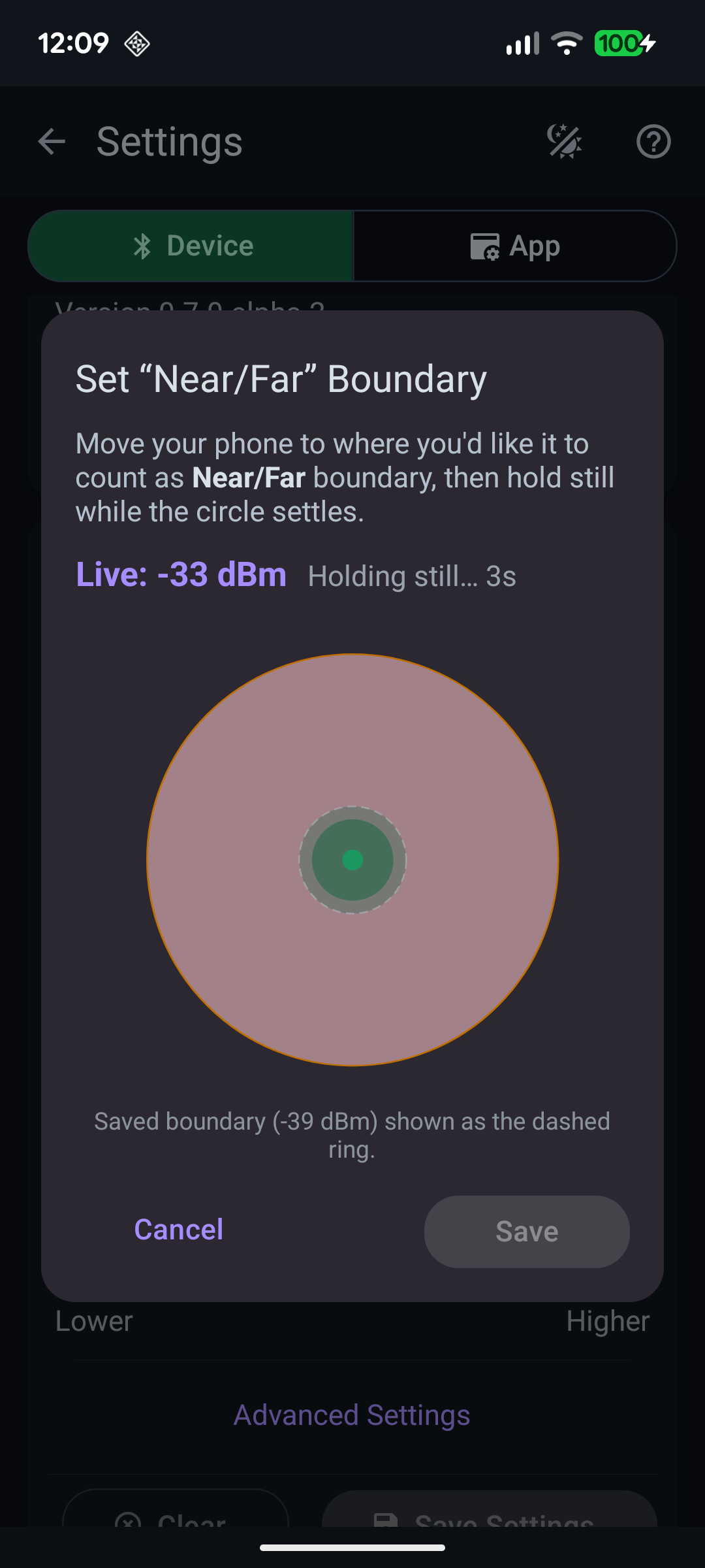 Bluetooth range/arming distance vary by phone and environment and its adjustable.